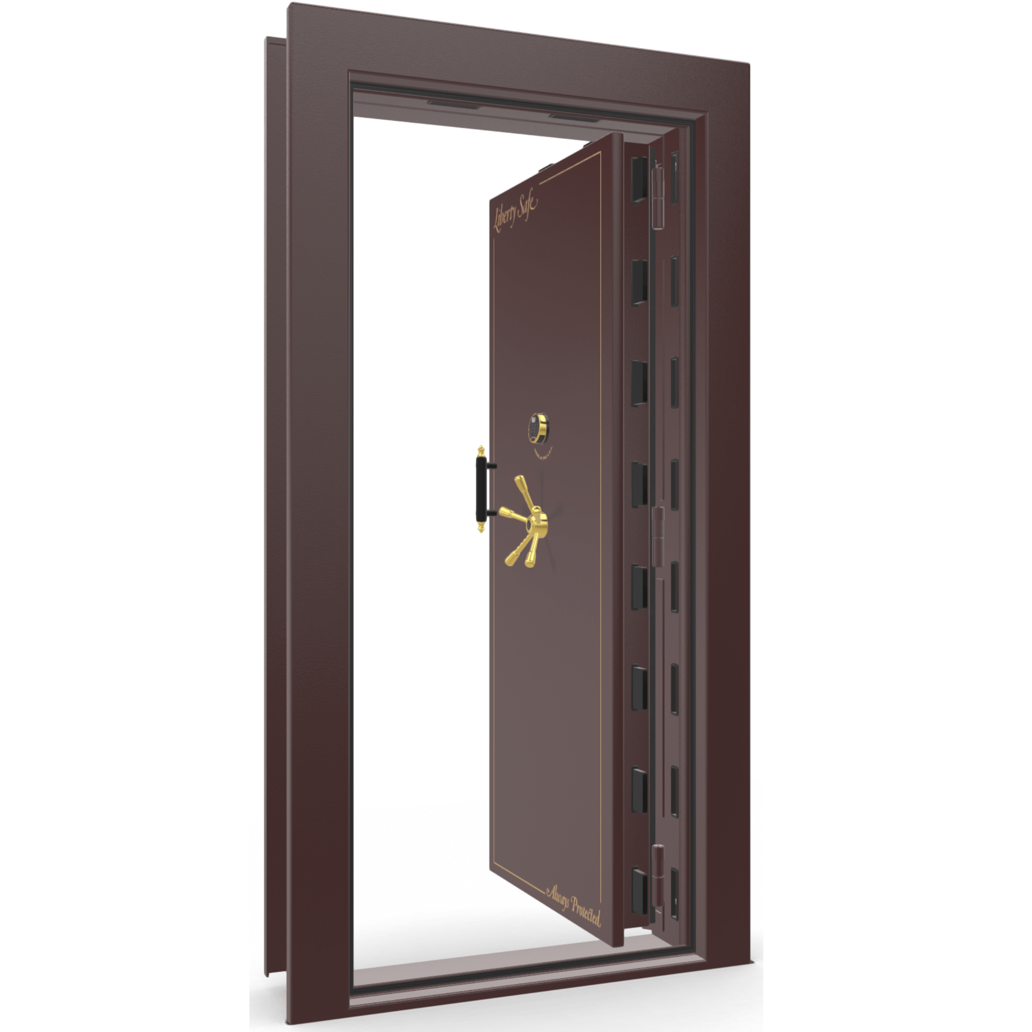 The Vault Door combines style with superior theft and fire protection for an elegant look that fits any decor. Massive 4-inch military style locking bars that are 1/2 inch thick will defend against any pry attacks. 2.5 hour fire rated door and heat-expanding Palusol door seal protects from smoke and heat. Vault Door includes both inside release 3-point handle and inside lock lever to lock door from the inside as a panic room. If your plans include a whole room full of items to protect...Liberty's Vault Door will get the job done.